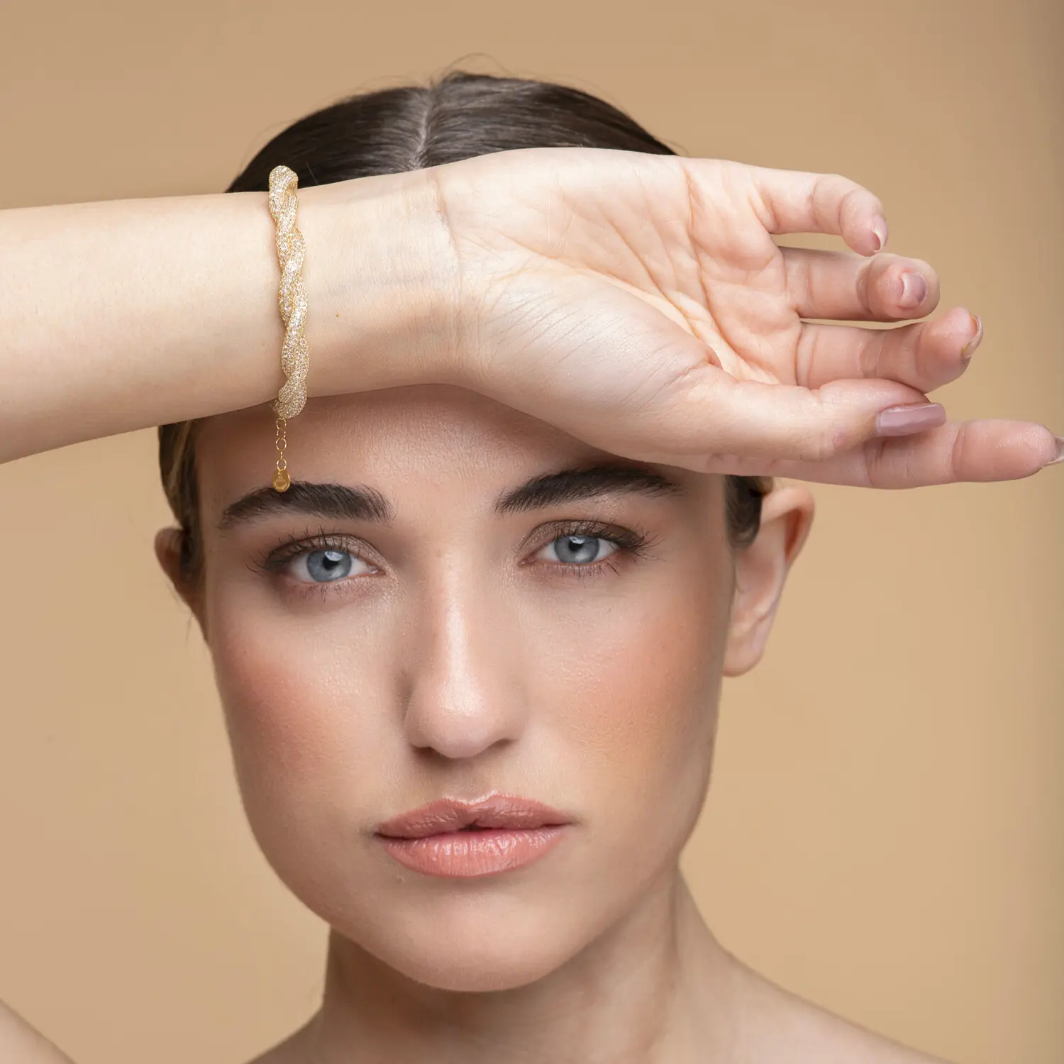 Bracciale Crystal doppio in argento fatto a mano con intreccio torchon, unisce artigianalità e design moderno per un look elegante e luminoso.